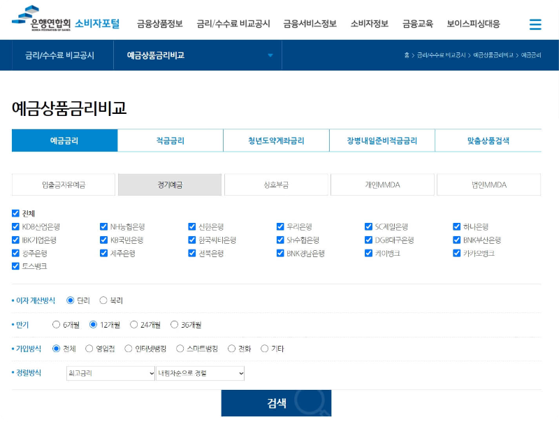먼저 원하는 은행권 전체를 선택해봤습니다. 그리고 이자 계산방식은 요즘은 거의 대부분 단리로 하니까 단리에 체크를 해주고요. 1년짜리 12개월 정기 예금을 선택해서 높은 이자부터 보여주는 내림차순 정렬을 선택했습니다.