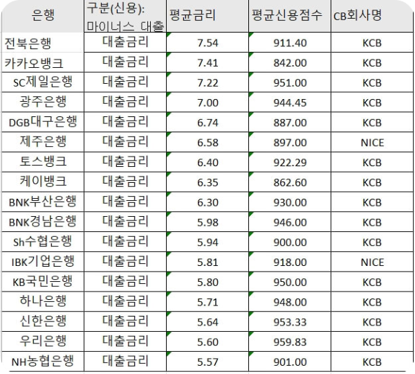 지방은행인 전북은행의 평균 대출 금리가 7.54%로 가장 높았네요. 그 뒤를 이어서 카카오뱅크가 7.41%로 2위를 차지했습니다. 인터넷으로만 영업을 하는 은행이어서 비용이 인건비와 점포 비용등이 상대적으로 적어 대출 금리도 낮을 것으로 생각됐는데, 그런 것이 아닌가 봅니다. 같은 인터넷 은행인 토스뱅크와 케이뱅크의 대출 금리도 각각 6.40%와 6.35%로 7번째와 8번째에 위치해 있네요. 그리고 시중은행보다 높은 금리로 자금을 조달해야 하는 지방은행들(전북은행, 광주은행, 대구은행, 제주은행)이 상위권에 위치해 있습니다. 그나마 제법 규모가 큰 부산은행과 경남은행은 중위권을 유지하고 있군요. 우리가 흔히 말하는 5대 시중은행(KB국민, 신한, 하나, 우리, NH농협)들은 5%대의 마이너스 대출 금리를 유지하고 있습니다. 왜 시중은행과 지방은행의 금리는 차이가 이처럼 크게 날까요? 여러가지 요인이 있는데, 다음 포스트에서 자세히 설명해 드려보겠습니다.