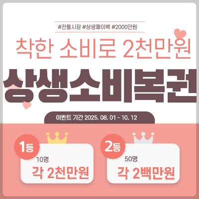• 응모 방법: 행사 기간 동안 전통시장, 소상공인 매장에서 쓴 누적 카드 결제액 5만원당 응모권 1장이 자동으로 생겨요. (1인당 최대 10장까지!)