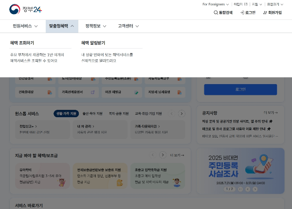 정부24 웹사이트의 핵심 메뉴인 '맞춤형 혜택'을 이용하면,